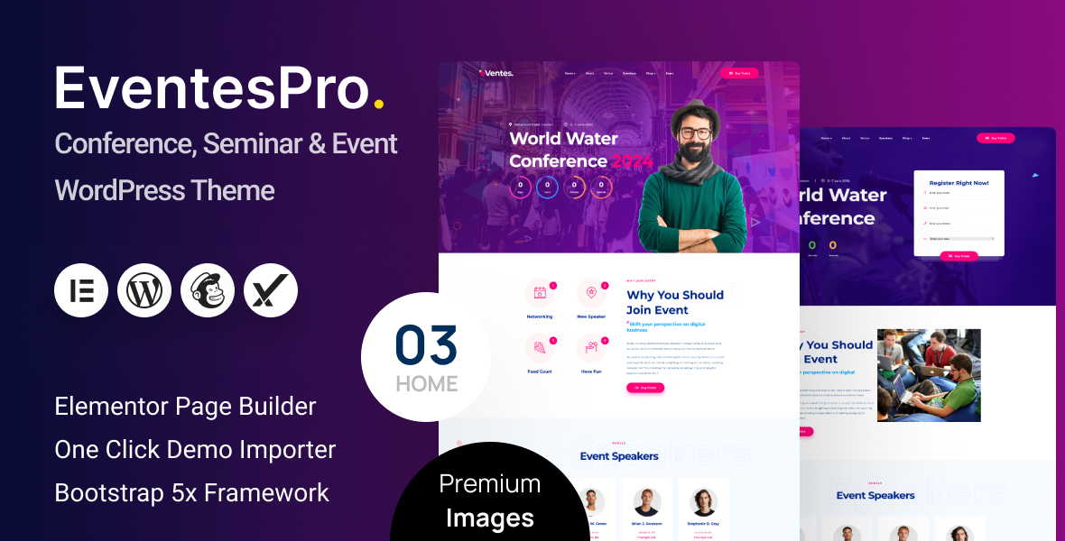 EventesPro – Conference and Event WordPress Theme Subtitle: The complete solution for Event Organizers, Conferences & Seminars. Sell tickets and display schedules in style!